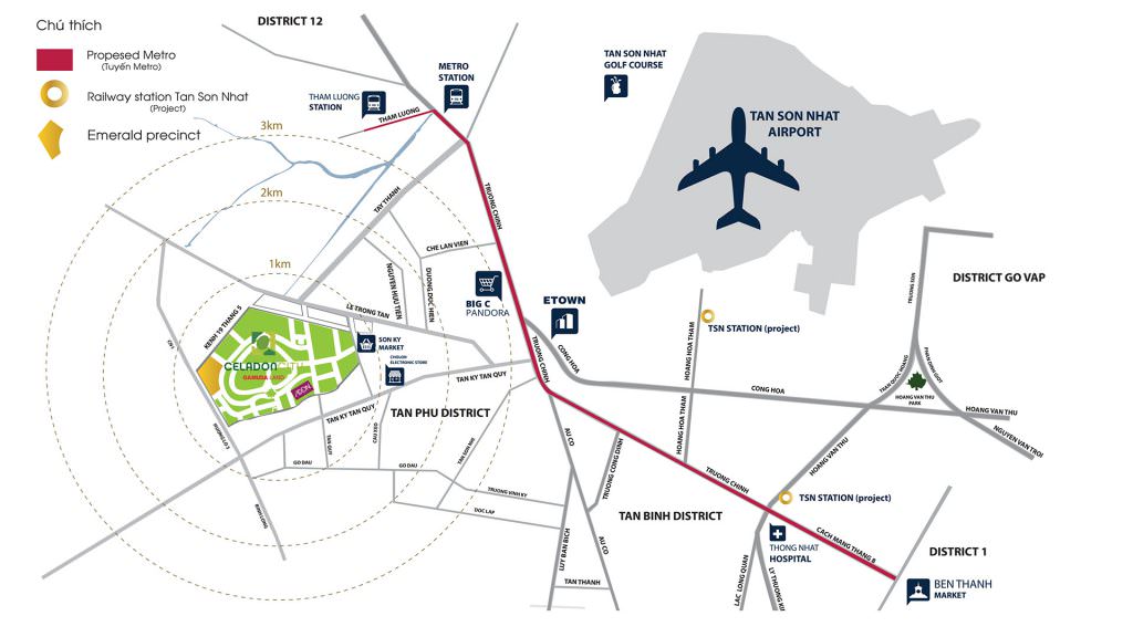 Tọa lạc tại vị trí đắc địa ở trung tâm quận Tân Phú, Celadon City là cửa ngõ giao thông huyết mạch kết nối với nhiều tuyến đường trọng điểm như Lê Trọng Tấn, Tân Kỳ Tân Quý, Cộng Hoà, Trường Chinh…đặc biệt là hệ thống tàu điện ngầm tương lai. Nhờ liên kết vùng linh hoạt và đa dạng hình thức kết nối (đường bộ, tuyến metro, đường hàng không), từ dự án việc di chuyển đến các địa điểm trong và ngoài thành phố vô cùng thuận tiện, nhanh chóng.